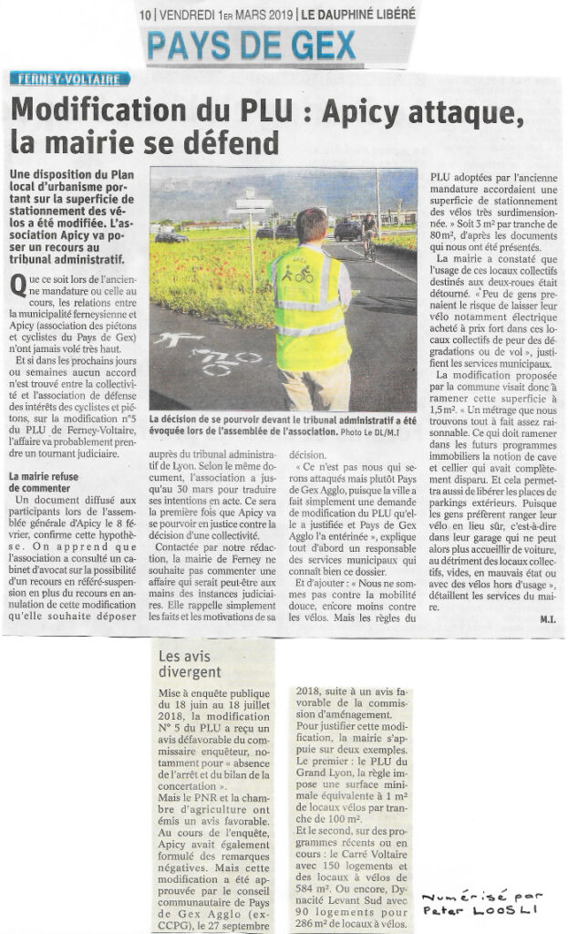 Un article du Dauphiné présente le recours que nous préparons contre la modification du PLU de Ferney-Voltaire concernant les surfaces de stationnements vélos. Comme d’habitude, l’argument de la mairie disant que les personnes n’utilisent pas les locaux vélos par peur du vol est cité. Cet argument est le comble de la mauvaise fois: nous sommes […]